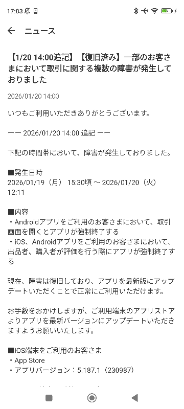 | 商品の特徴 | メルカリで取引中の画面にいこうとするとアプリが落ちてしまって開け。返信、発送できた!メルカリの取引画面がエラーで開けないときの対処法。返信、発送できた!メルカリの取引画面がエラーで開けないときの対処法。2026.01.19 18:40頃メルカリ様の通信障害により取り引き画面にいけずアプリが落ちてしまう状況で現在メッセージが出来ません...お取り引き中の方、メッセージ出来ず大変申し訳ありません...取引画面が開かない障害状況に関する情報です。。メルカリのエラーで取引画面が見られなくなったのですが、どうしたらな。- 障害状況: 一部のお客様において取引画面が開けない事象が発生中- サービス状況: AndroidアプリとiOSアプリで取引画面が開かない問題が発生中ご覧いただきありがとうございます。ダリオ・アルジェント : 恐怖の幾何学 初版 サイン付き | ||